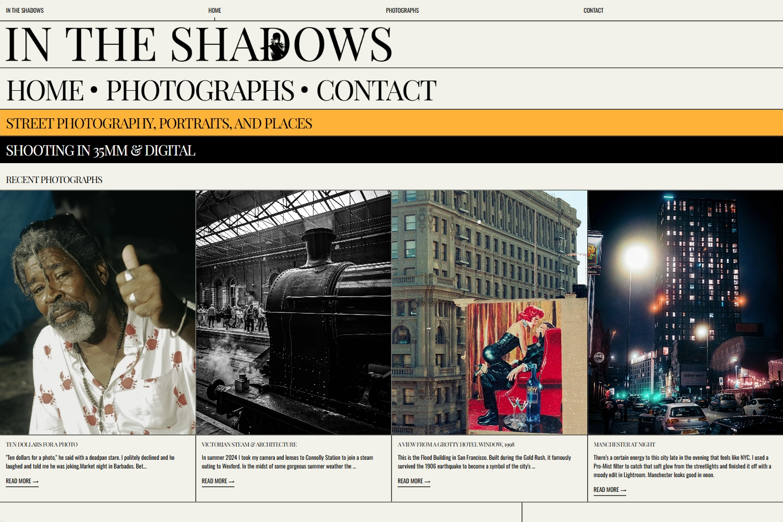 Some times a web developer just needs to do something for himself with no constraints and no client criteria. In The Shadows is a side project for Ruairi of Perfidious Albert showcasing his photography "talents".